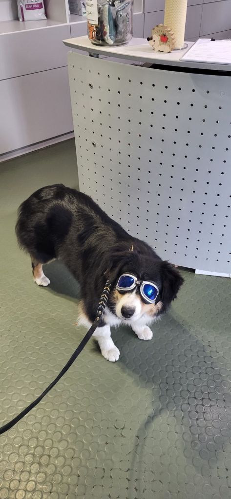 Für die Untersuchung werden ihr Tropfen verabreichen, die ihre Pupillen weiten, also gabs für die Heimfahrt eine Sonnenbrille.