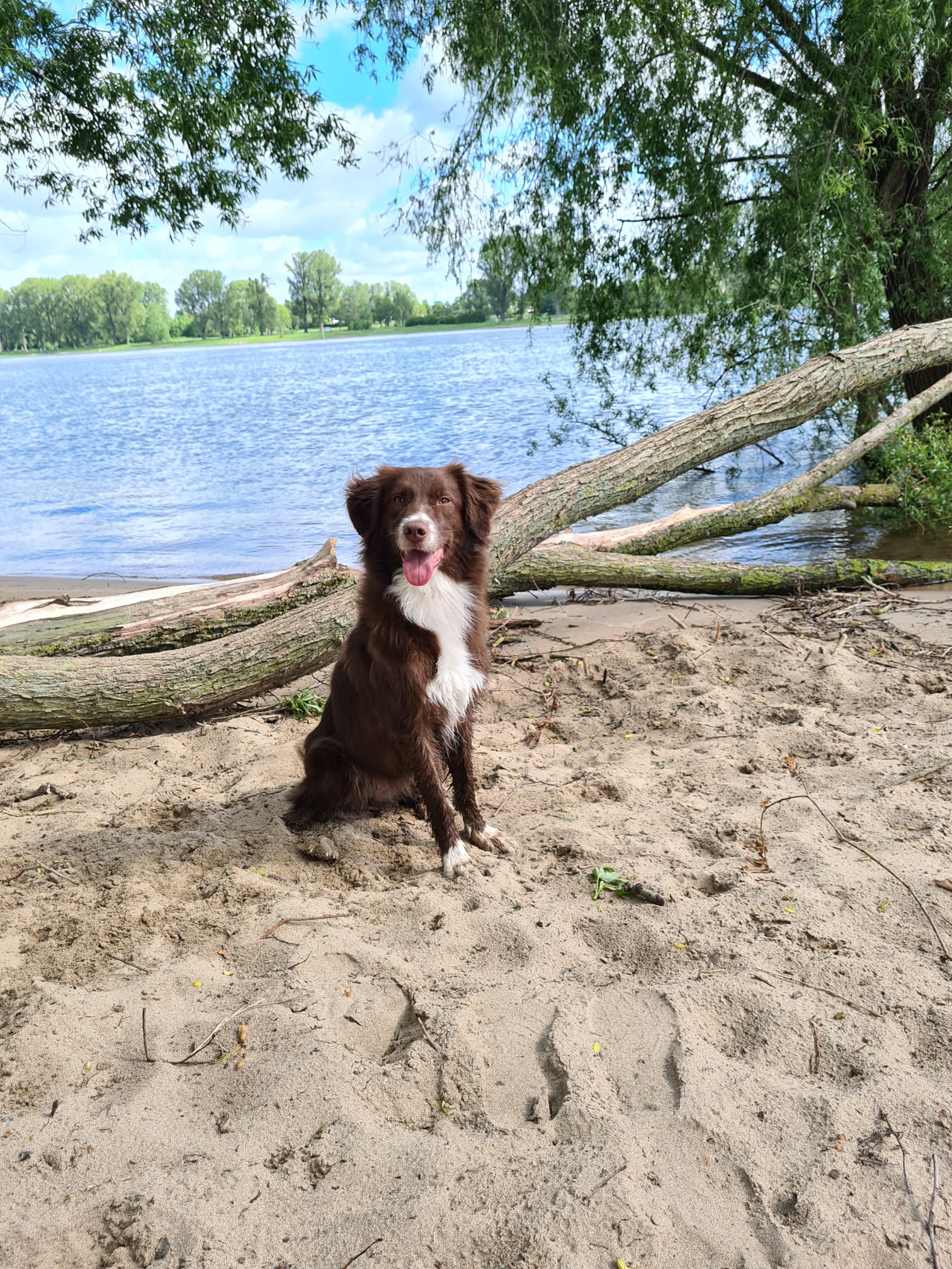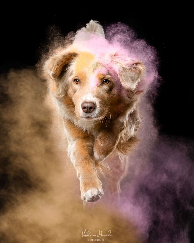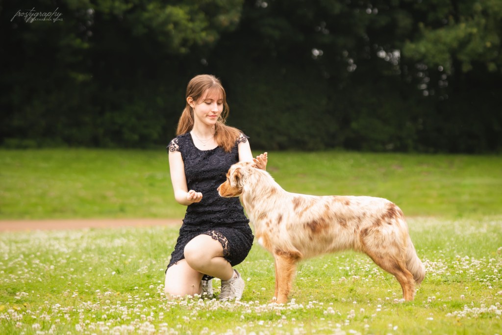 Tiana ist eine super gelehrige junge Dame mit ganz viel „will to please“. Sie lässt sich leicht führen, hat aber eine ordentliche Portion Power intus. Das zeigt sie gerne draußen. Sie läuft allerdings von Anfang an frei, auch am Pferd, da ihr Rückruf einfach super zuverlässig sitzt. Sie hat einen gut kontrollierbaren Jagd- und Hütetrieb. Mit anderen Hunden ist sie sehr verträglich und unkompliziert. Das zeigt sie auch immer wieder, wenn ich sie in die Tierarztpraxis mitnehme, in der ich arbeite. Im Spiel mit anderen Hunden erkennt man Ihre guten Führungsqualitäten, wenn sie mal wieder unentspannte aufgedrehte Hunde „runterholt“. Aber auch hier ist sie jederzeit abrufbar. Sie wird sicher eine gute Hundemama.