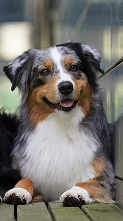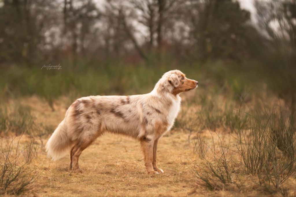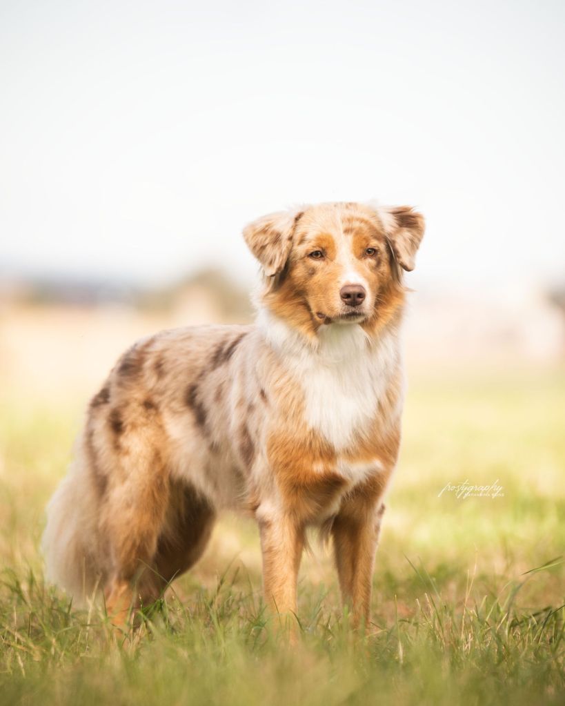 Farbe: red merle w/c; Augenfarbe: amber; Rute: lang; Größe: aktuell 52,5 cm; Gewicht: aktuell 20,7 kg