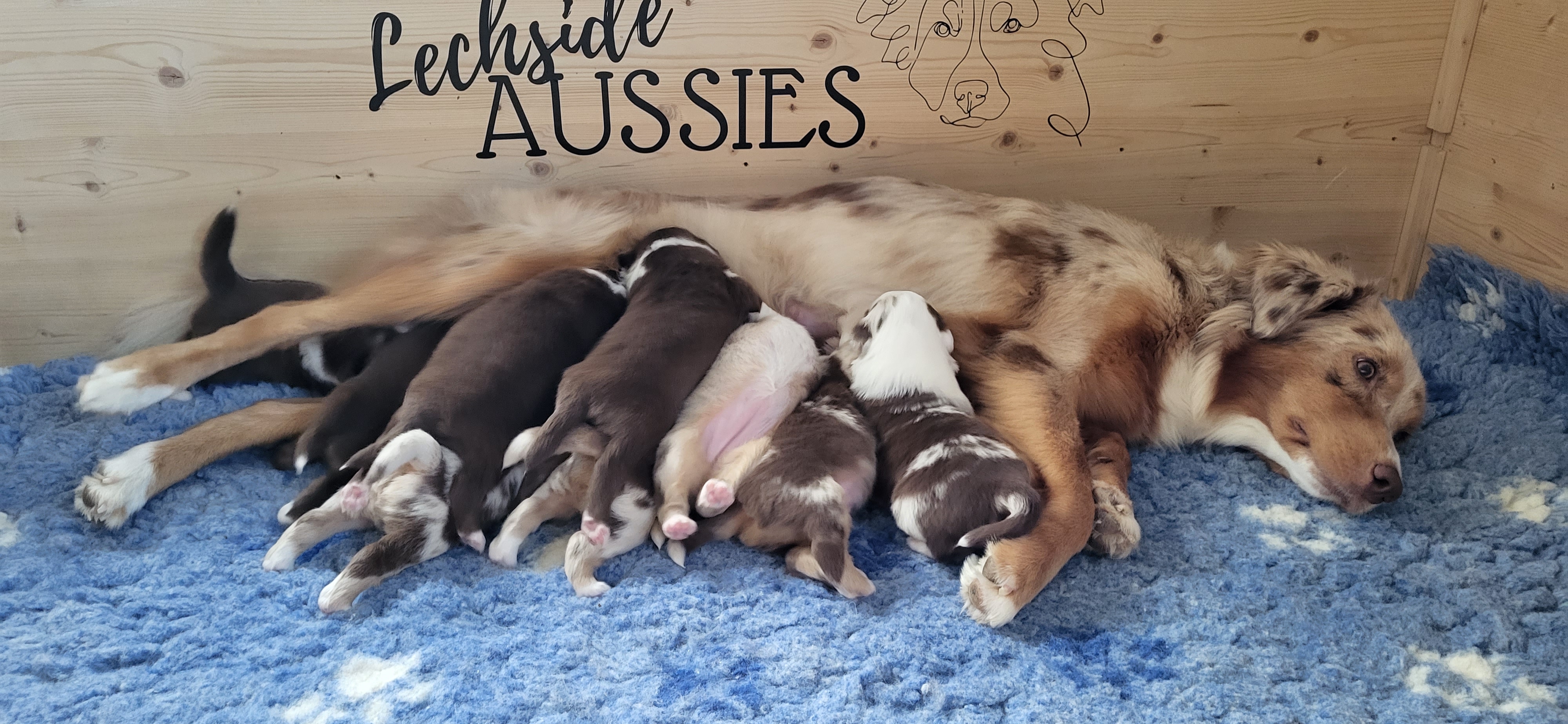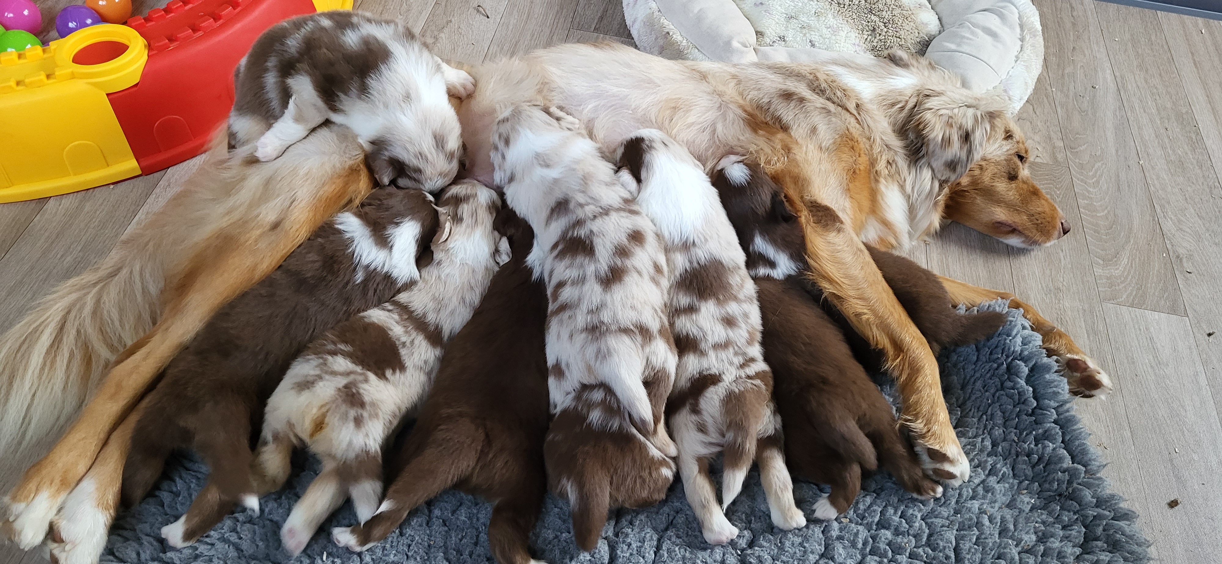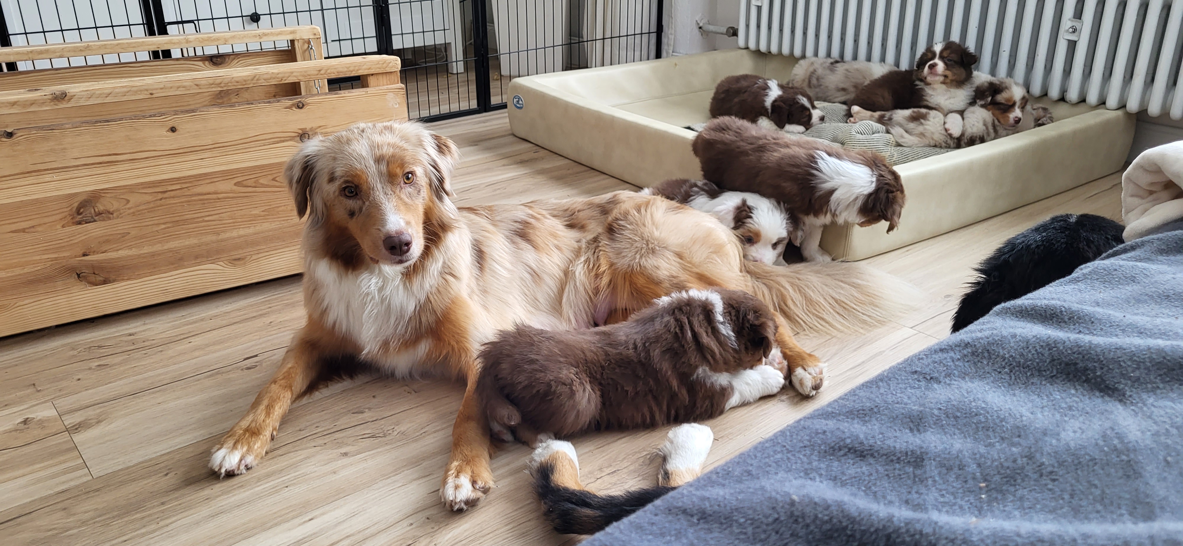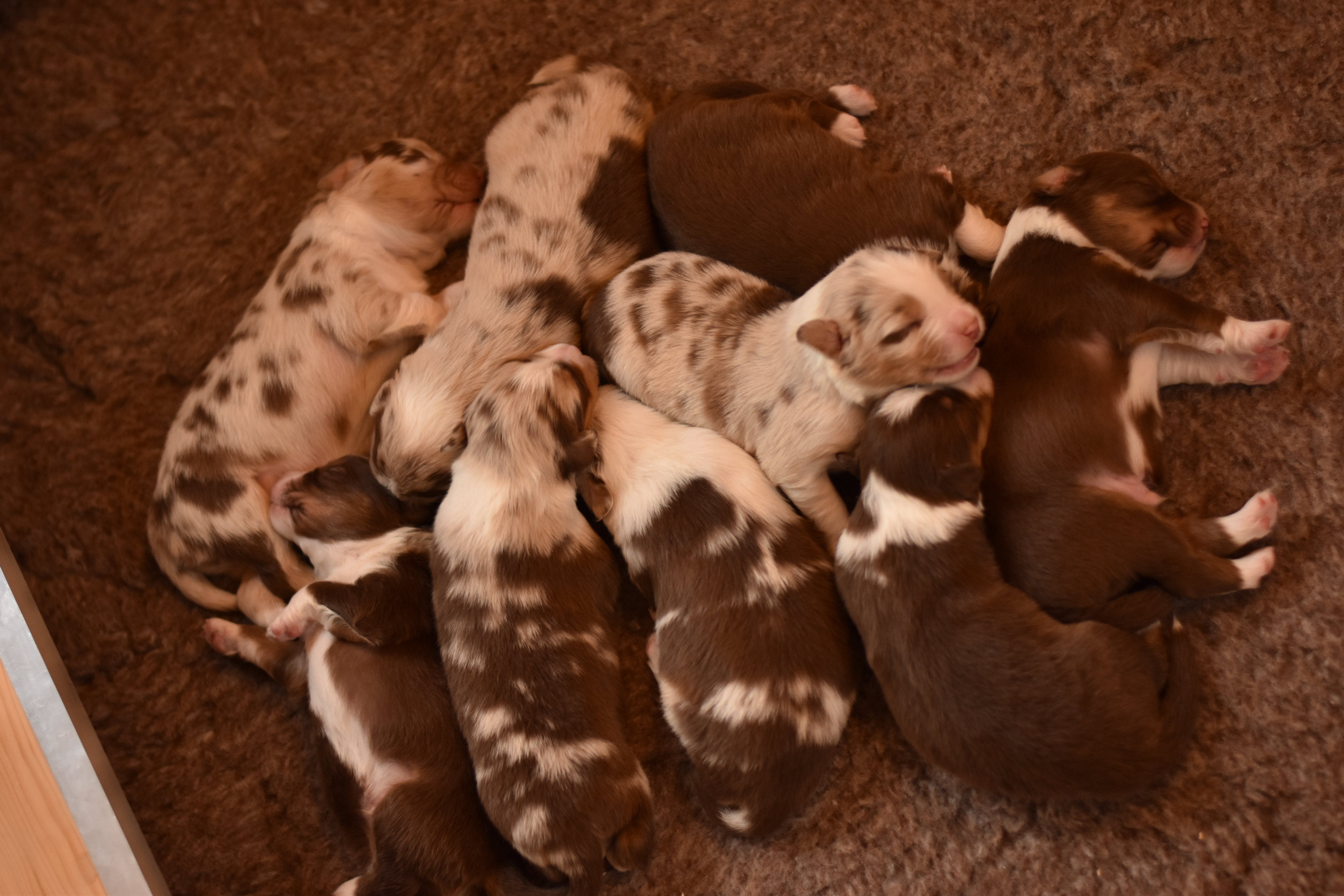 Eine Hündin trägt durchschnittlich 63 Tage. Eine Geburt leitet die Hündin mit der Eröffnungsphase ein. Diese Phase dauert 6-36 Stunden. Unsere Welpen werden im Wohnzimmer geboren und wachsen im engsten Familienanschluss auf. Sie durchlaufen alle vom 3. Tag an bis zum 16. Tag das FNS Programm (Fühzeitige neurologische Stimulation). Das bedeutet, jeder Welpe wird für wenige Sekunden einer kleineren Menge Stress unterzogen, in dem man ihn mit einem Q-Tipp an den Pfoten kitzelt, kurz auf den Rücken dreht, aufrecht und kopfüber hält und am Ende noch auf einen feuchten Waschlappen setzt. Diese Methode wurde von der Armee für die Züchtung von Militärhunden erfunden und danach jahrzehntelang erforscht. Der Körper lernt somit von klein auf, eine dosierten Menge Stress zu verarbeiten. Es steigert die Stresstoleranz. Aber natürlich gewöhnen wir sie auch an alles, was ihnen später ihr Leben als Familienmitglied leichter macht. Dazu gehört zum Beispiel der Staubsauger, Küchengeräte, spielende Kinder, unsere Katze sowie unsere Pferde, das Autofahren, Silvesterfeuerwerk und Autofahren.