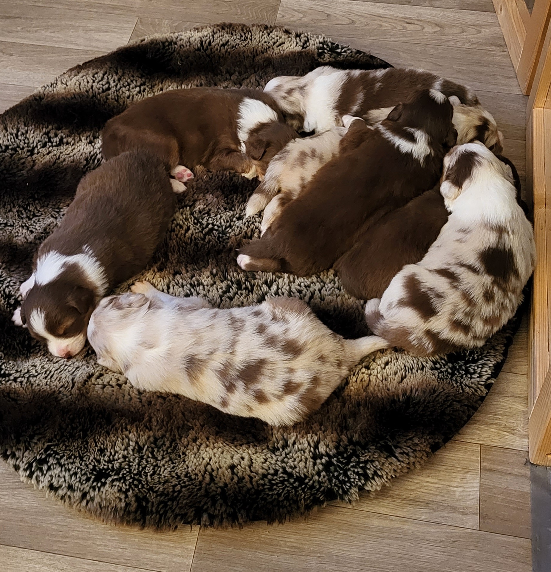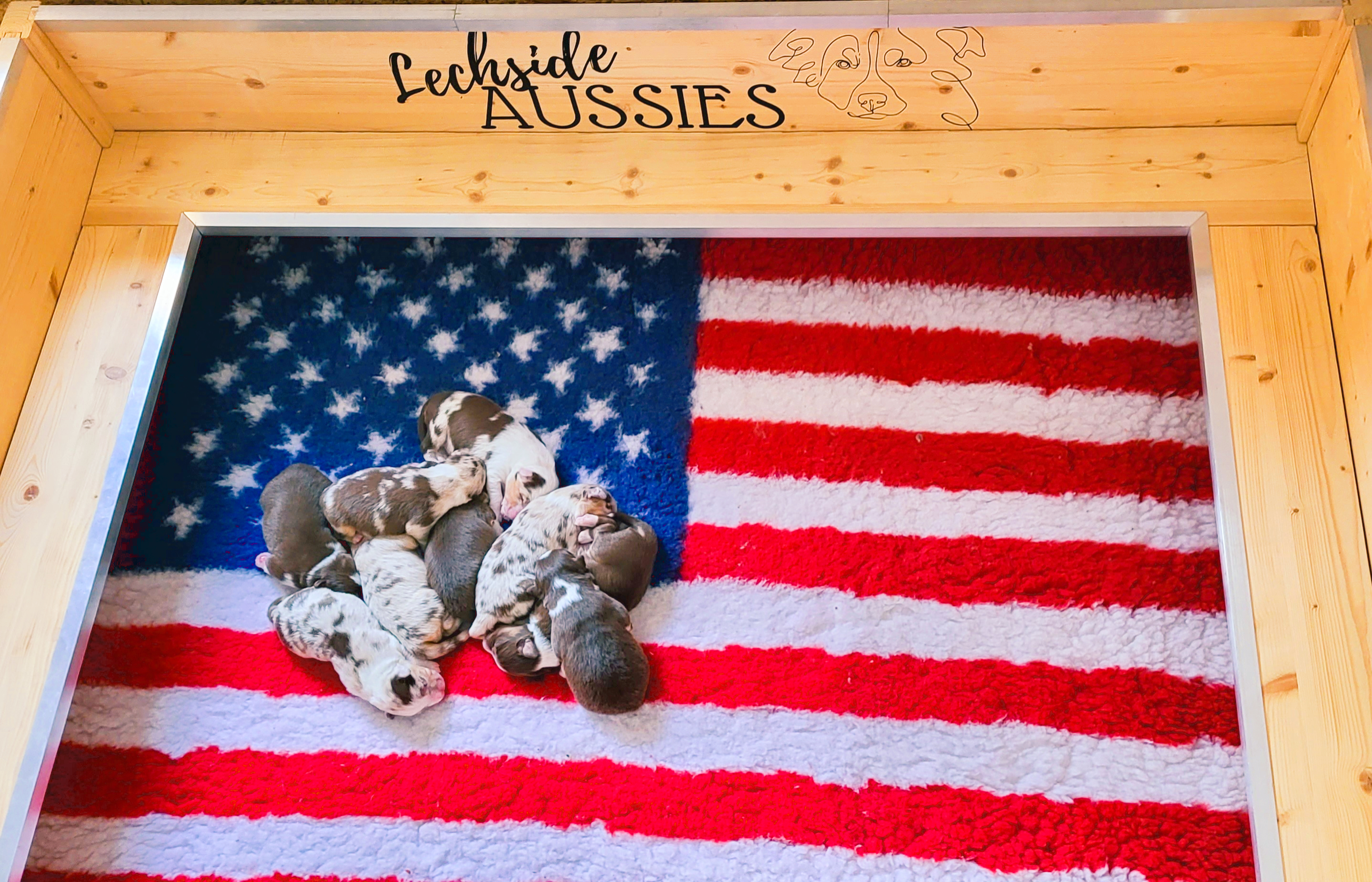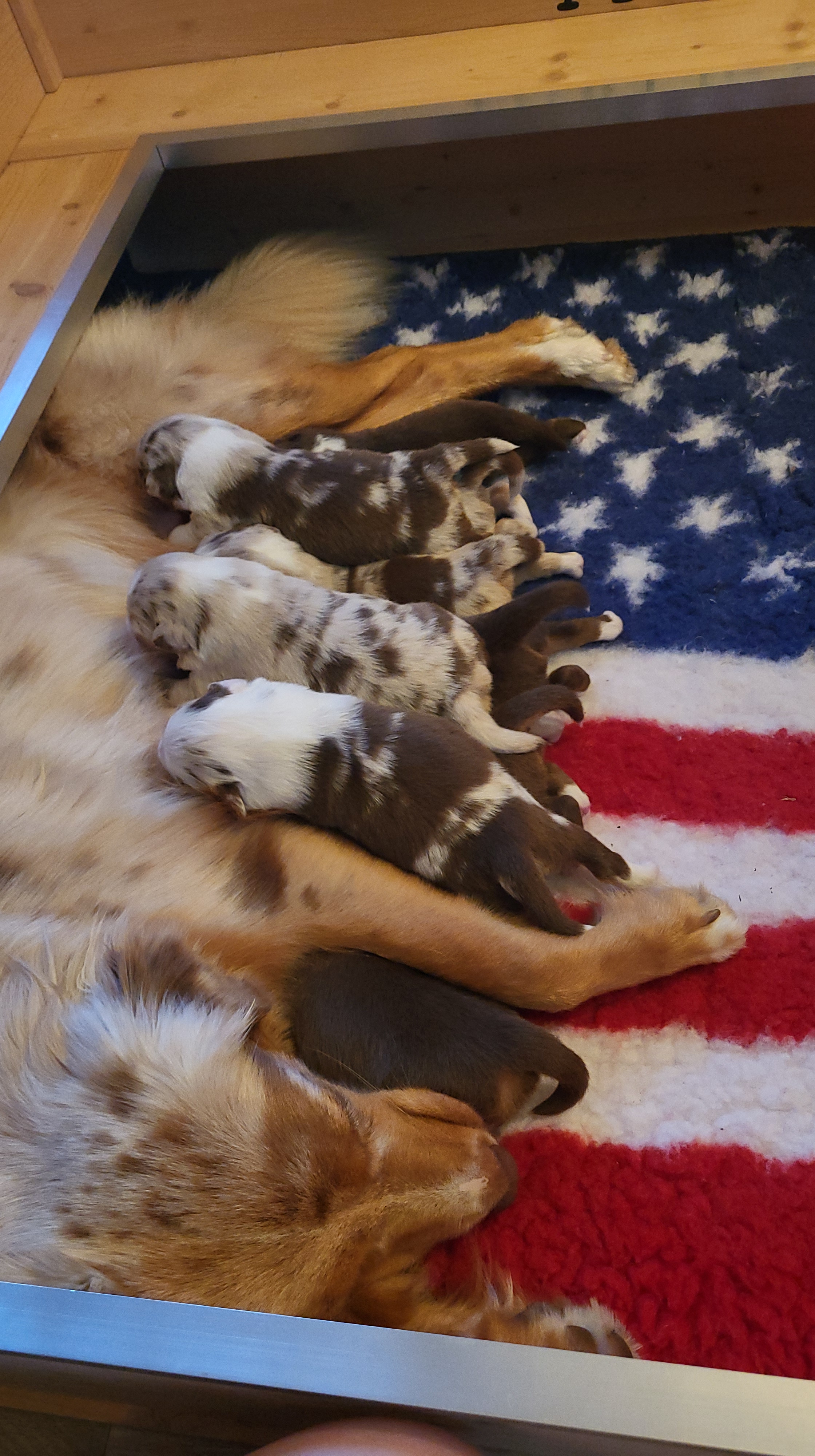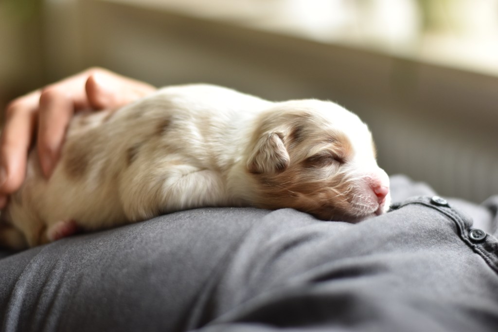 Eine Hündin trägt durchschnittlich 63 Tage. Eine Geburt leitet die Hündin mit der Eröffnungsphase ein. Diese Phase dauert 6-36 Stunden. Unsere Welpen werden im Wohnzimmer geboren und wachsen im engsten Familienanschluss auf. Sie durchlaufen alle vom 3. Tag an bis zum 16. Tag das FNS Programm (Fühzeitige neurologische Stimulation). Das bedeutet, jeder Welpe wird für wenige Sekunden einer kleineren Menge Stress unterzogen, in dem man ihn mit einem Q-Tipp an den Pfoten kitzelt, kurz auf den Rücken dreht, aufrecht und kopfüber hält und am Ende noch auf einen feuchten Waschlappen setzt. Diese Methode wurde von der Armee für die Züchtung von Militärhunden erfunden und danach jahrzehntelang erforscht. Der Körper lernt somit von klein auf, eine dosierten Menge Stress zu verarbeiten. Es steigert die Stresstoleranz. Aber natürlich gewöhnen wir sie auch an alles, was ihnen später ihr Leben als Familienmitglied leichter macht. Dazu gehört zum Beispiel der Staubsauger, Küchengeräte, spielende Kinder, unsere Katze sowie unsere Pferde, das Autofahren, Silvesterfeuerwerk und Autofahren.