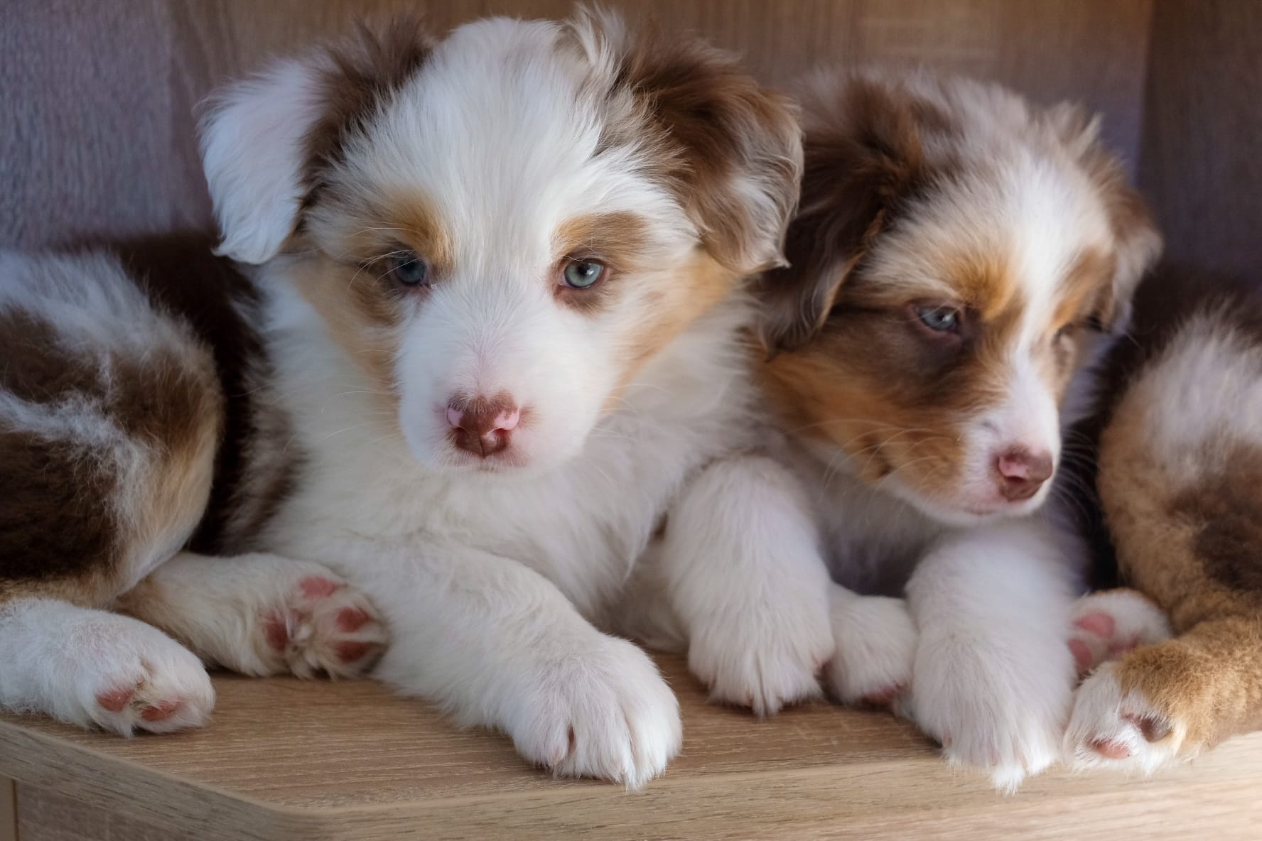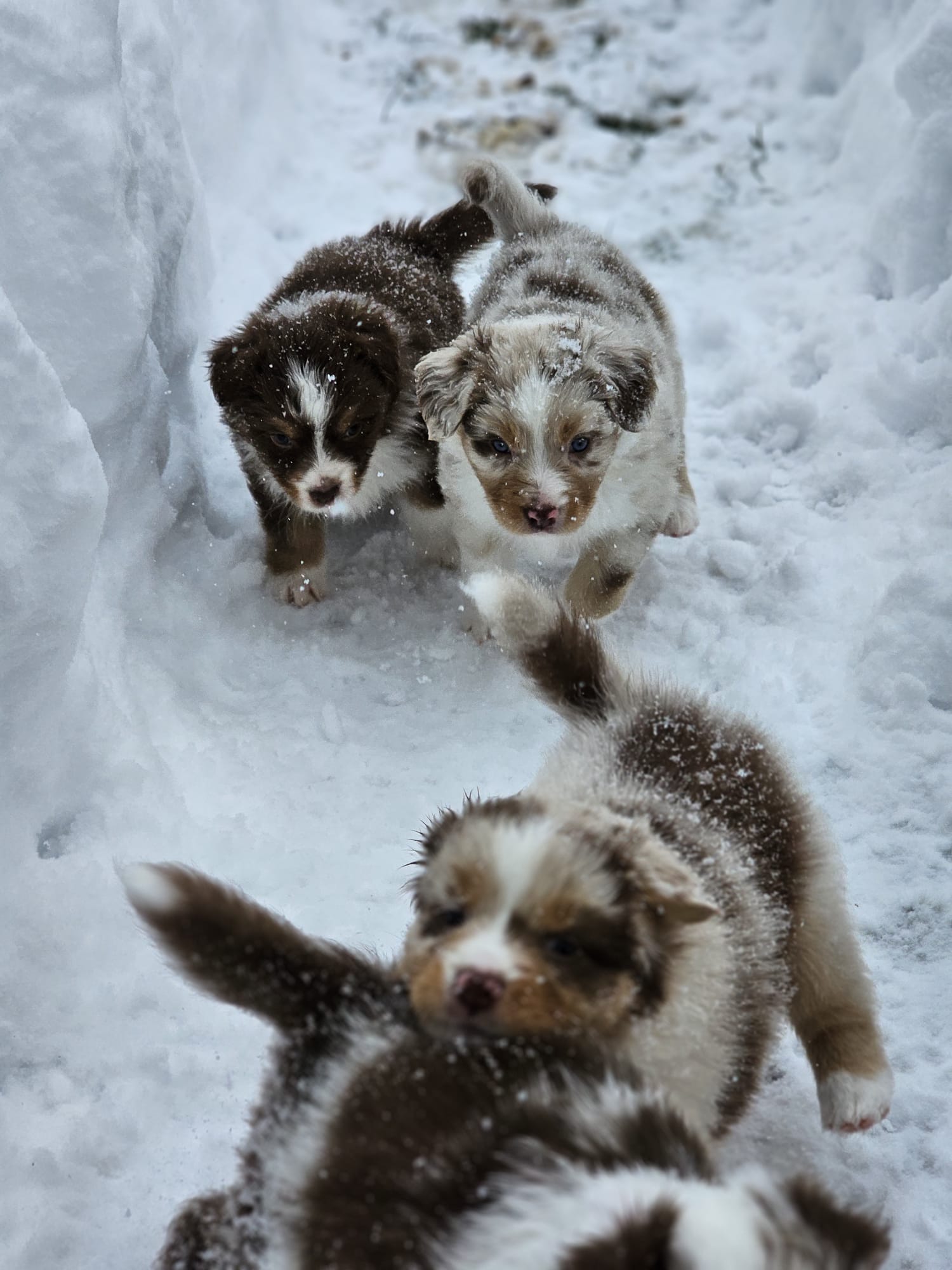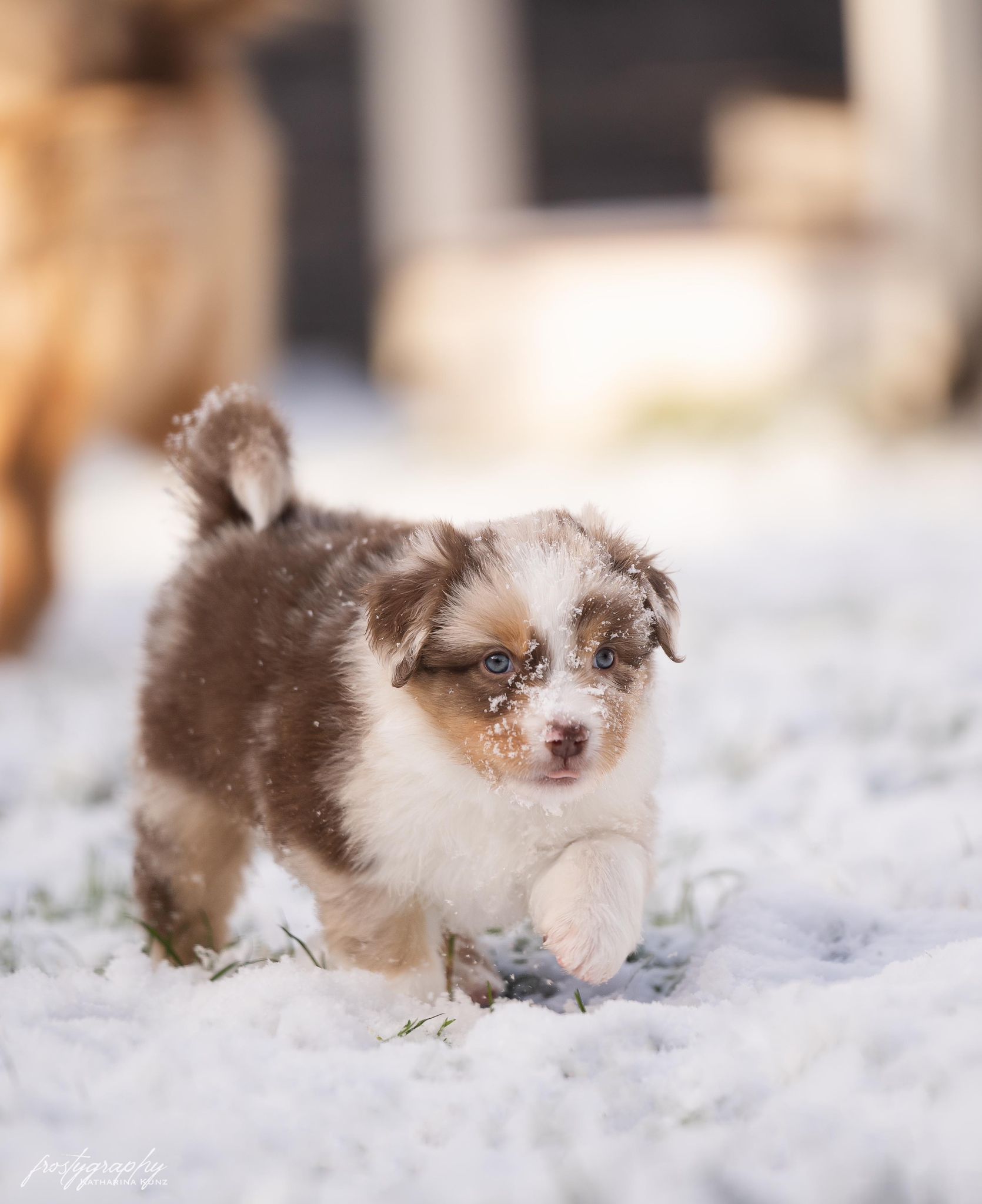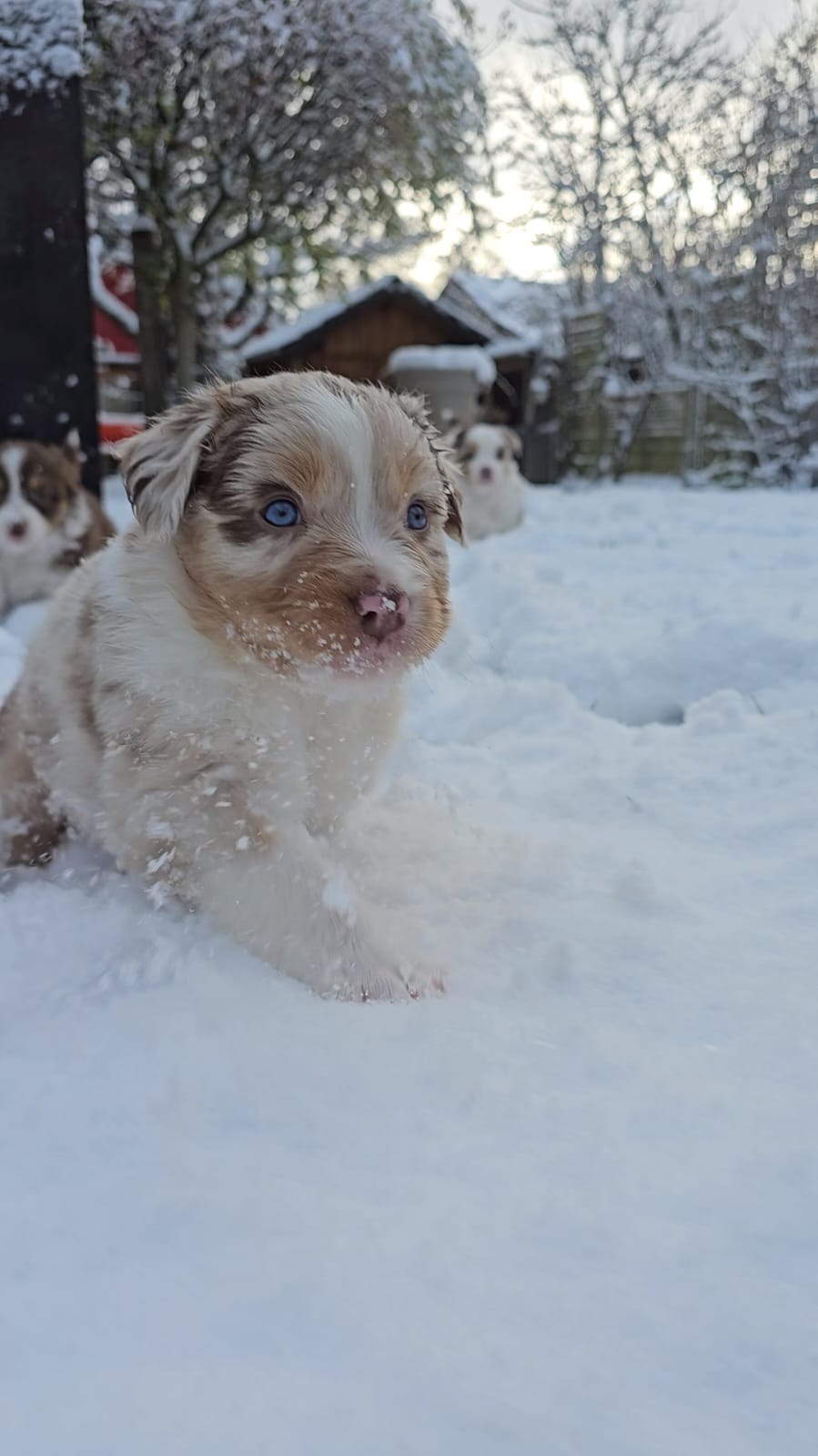 Eine Hündin trägt durchschnittlich 63 Tage. Eine Geburt leitet die Hündin mit der Eröffnungsphase ein. Diese Phase dauert 6-36 Stunden. Unsere Welpen werden im Wohnzimmer geboren und wachsen im engsten Familienanschluss auf. Sie durchlaufen alle vom 3. Tag an bis zum 16. Tag das FNS Programm (Fühzeitige neurologische Stimulation). Das bedeutet, jeder Welpe wird für wenige Sekunden einer kleineren Menge Stress unterzogen, in dem man ihn mit einem Q-Tipp an den Pfoten kitzelt, kurz auf den Rücken dreht, aufrecht und kopfüber hält und am Ende noch auf einen feuchten Waschlappen setzt. Diese Methode wurde von der Armee für die Züchtung von Militärhunden erfunden und danach jahrzehntelang erforscht. Der Körper lernt somit von klein auf, eine dosierten Menge Stress zu verarbeiten. Es steigert die Stresstoleranz. Aber natürlich gewöhnen wir sie auch an alles, was ihnen später ihr Leben als Familienmitglied leichter macht. Dazu gehört zum Beispiel der Staubsauger, Küchengeräte, spielende Kinder, unsere Katze sowie unsere Pferde, das Autofahren, Silvesterfeuerwerk und Autofahren.