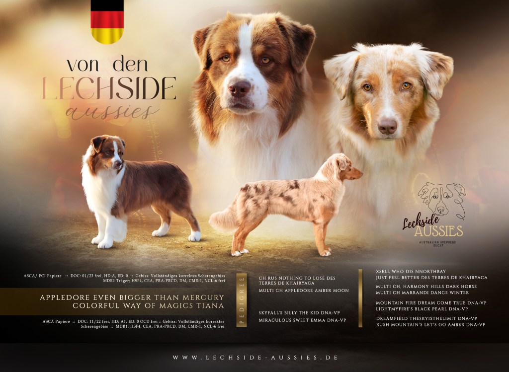 10 wunderschöne Welpen haben am 22.10.2023 das Licht der Welt erblickt. Nur die kleine Queeni (Lechside´s might have been Queen) hat bereits im Bauch ihre nächste Reise angetreten. Sie hat mit nur 123g die Geburt einfach nicht gepackt. Sie war ein Ebenbild von Mama Tiana. Der Rest der Welpen ist wohl auf und die Verteilung ist wie folgt: